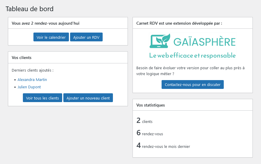 3W Agenda n’est pas un autre service externe mais une extension WordPress dédiée à la prise de rendez-vous. Elle s’installe sur votre site Internet et fonctionne en autonomie. Une fois connecté à votre interface d’administration, vous pouvez gérer vos clients et rendez-vous et paramétrer des notifications par SMS ou e-mail.