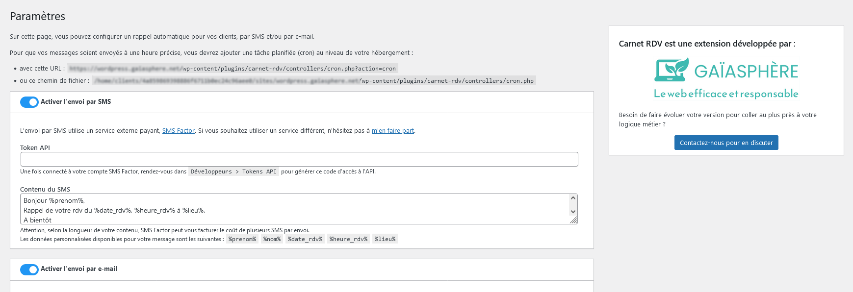 NB : pour les notifications par SMS, 3W Agenda utilise par défaut le service SMS Factor.